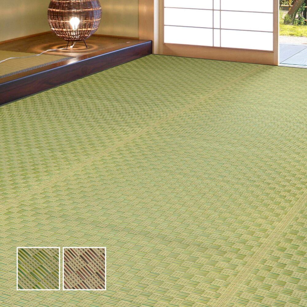 濃いめの染めい草を使った和モダンでおしゃれな、市松柄のい草カーペット。「若月シリーズ」は、お部屋のラグとしてや、畳を保護する上敷きとしてなどの豊富なサイズバリエーションに、用途にあわせて裏地の有無もお選びいただけます。こちらは薄手で扱いやすく、畳本来のクッション性を活かせるため和室におすすめな裏地なしタイプ。