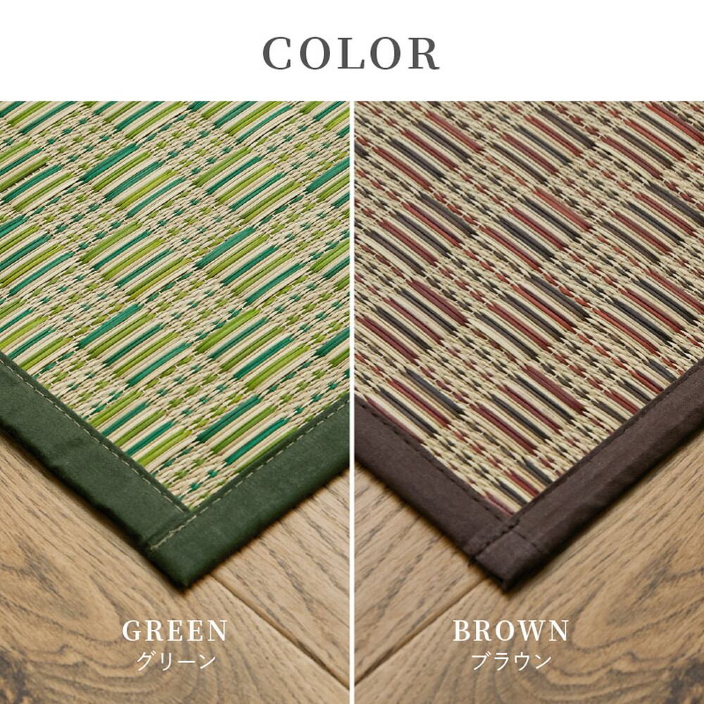 濃いめの染めい草を使った和モダンでおしゃれな、市松柄のい草カーペット。「若月シリーズ」は、お部屋のラグとしてや、畳を保護する上敷きとしてなどの豊富なサイズバリエーションに、用途にあわせて裏地の有無もお選びいただけます。こちらは薄手で扱いやすく、畳本来のクッション性を活かせるため和室におすすめな裏地なしタイプ。
