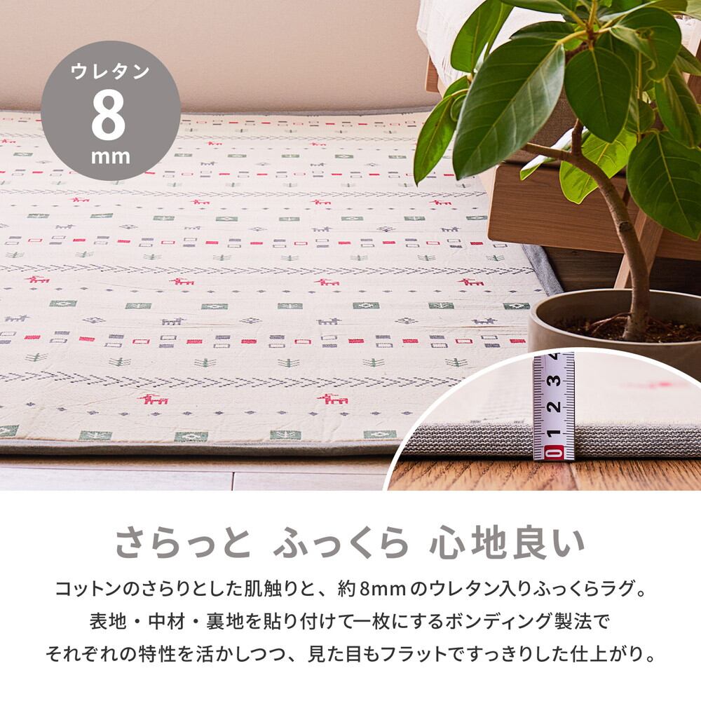 ウレタンを8mm使用し、ふっくらとした仕上がりで床の硬さを軽減。裏面は滑り止めが付きで、ラグがズレにくいのも嬉しいポイント◎