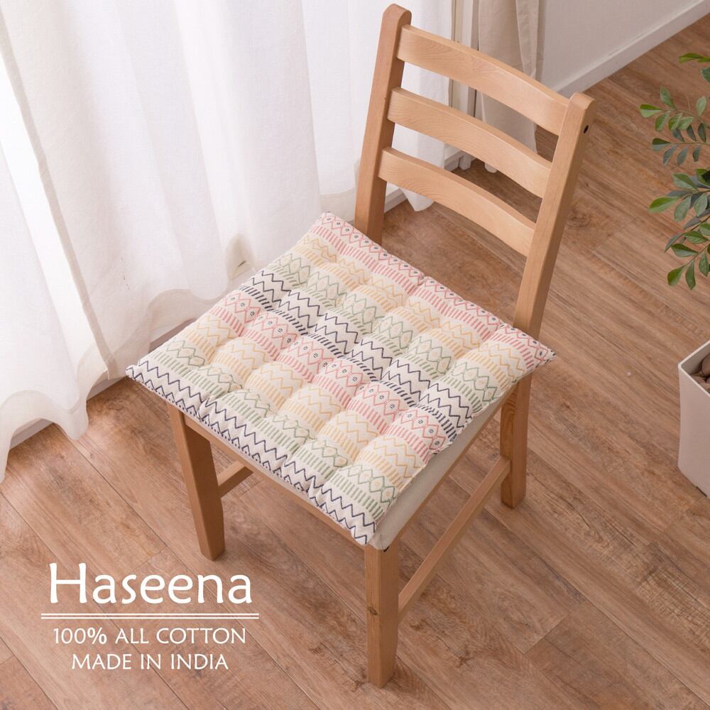 さらっとした触り心地と素朴な風合いが魅力のインド綿。マルチカラーがかわいいシートクッションです。適度な厚みでおしりサポートし、椅子以外にも床やソファ、車のシートなど様々な場所で活躍!裏面も同一生地を使用しています。