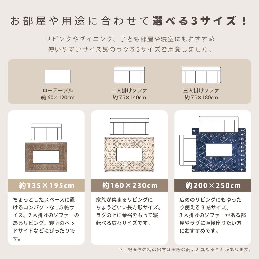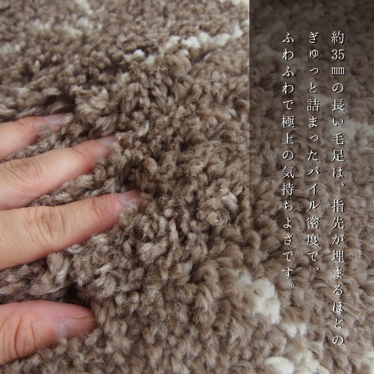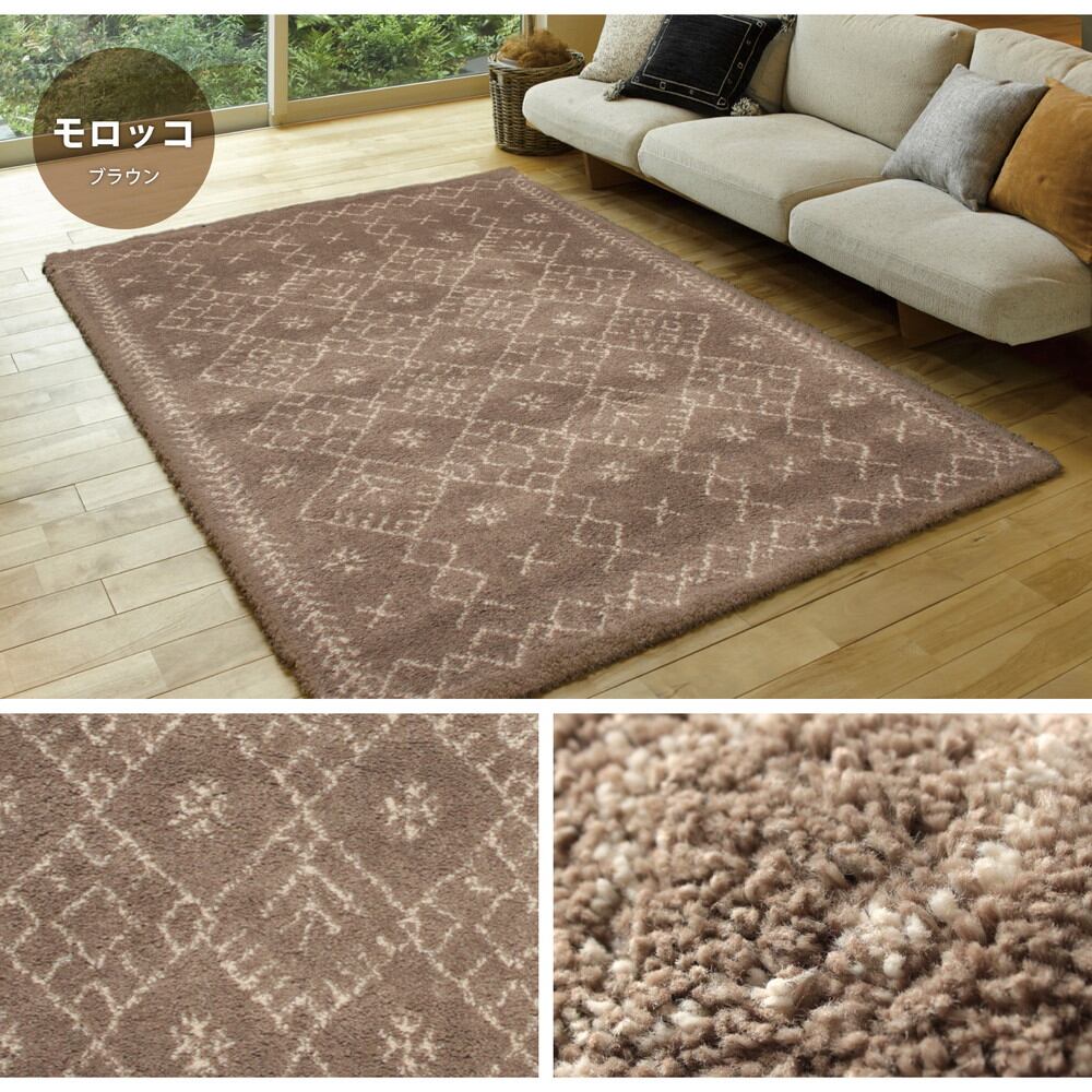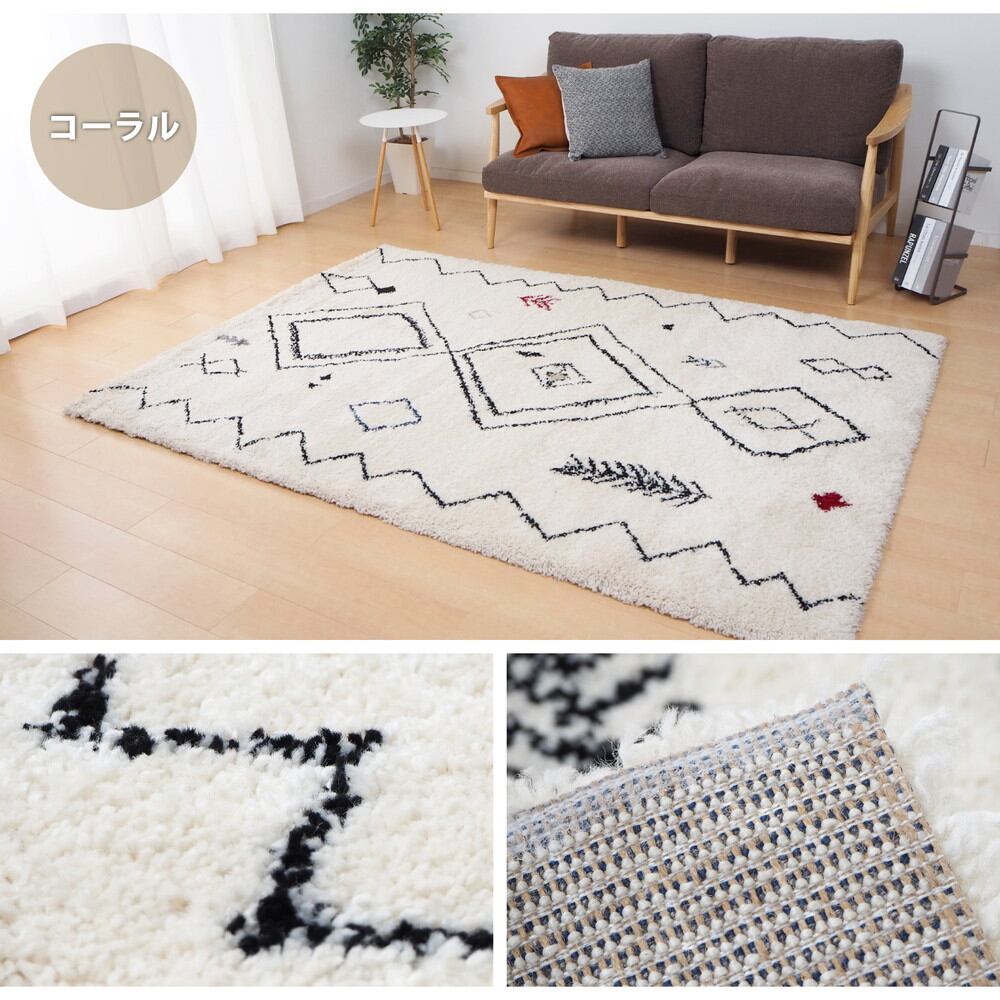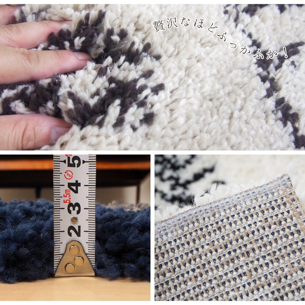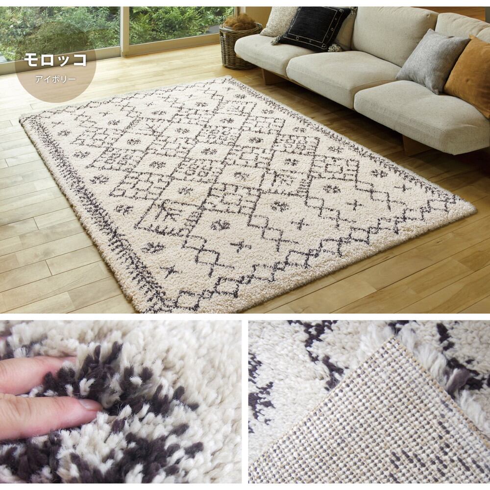 人気のギャッベ風デザインを表現したウィルトン長毛ラグ。民族調のあたたかみのある雰囲気が、空間をやさしく包み込みます。約35mmの長い毛足は、指先が埋まるほどのぎゅっと詰まったパイル密度で、ふわふわで極上の気持ちよさです。ヒートセット加工を施すことにより、ウールに似たタッチ感やへたりにくさをプラスしました。耐久性に優れているウィルトン織なので、長く使いたい方におすすめです。