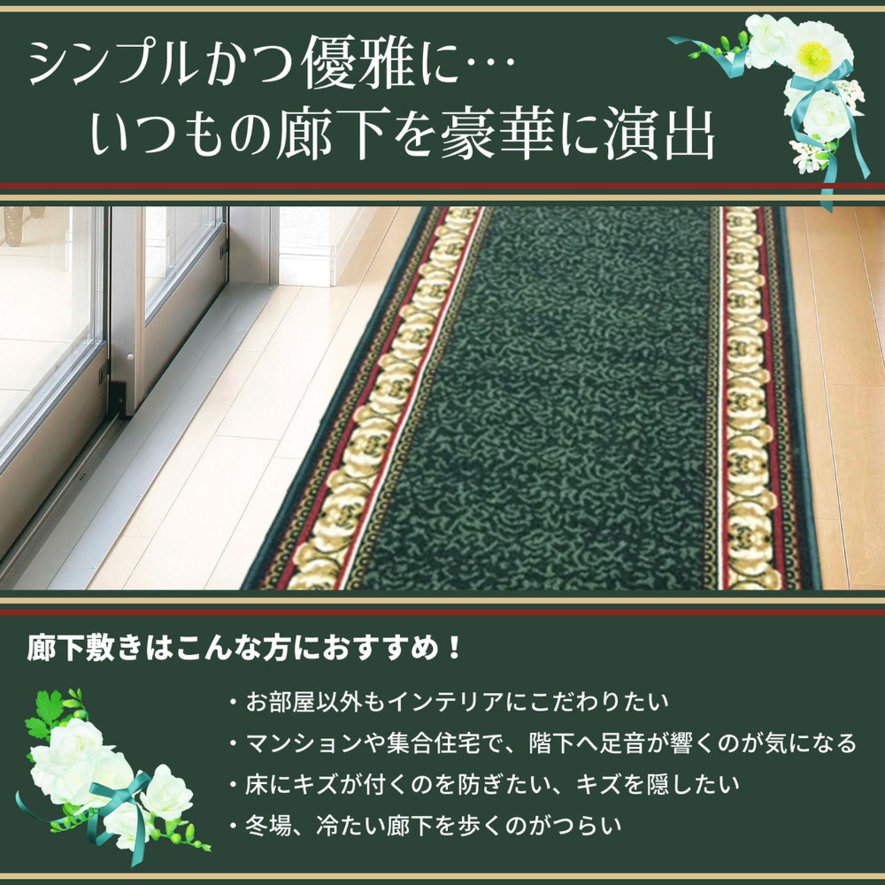 シンプル且つ端の優雅なデザインが廊下を華やかに演出。階下への防音効果も兼ね備えたロングカーペットです。☆ 特徴 ☆ 1.手洗いできるから、いつでもきれいをキープ。キッチンマットなどとして水回りにもおすすめです。2.短めのパイルなので、掃除機がかけやすい。3.硬めの生地で、毛がへたりにくく長持ちしやすい。4.裏面は、床を傷つけにくい不織布貼り。5.裏面は、滑りにくい加工付き。6.スペースに合わせて選べるよう多サイズ展開。7.カラーは、上品なグリーンと落ち着いたベージュをご用意。