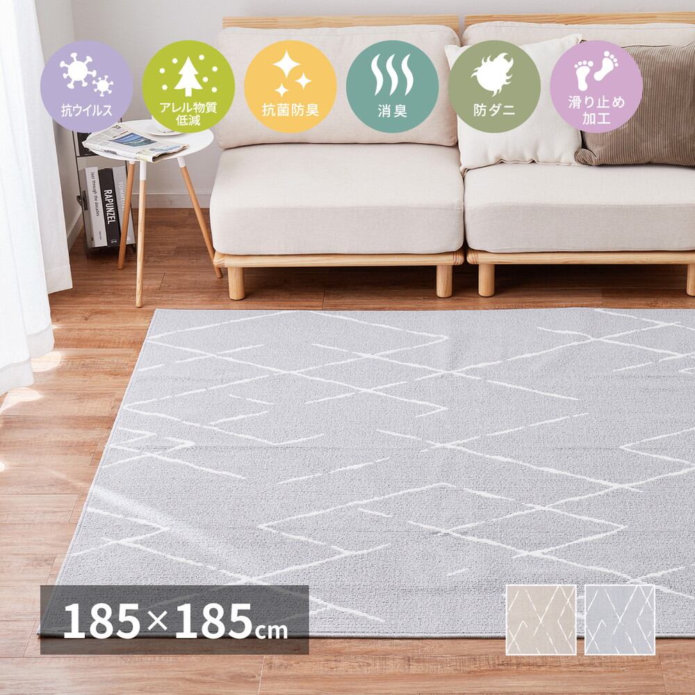 抗ウイルス、抗アレルゲン機能にアース防ダニも追加した高スペックラグ。絶妙なカラーに華奢な白いラインが引かれた、おしゃれで品のあるデザインです。毛足が短めでお手入れしやすく、汚れても手洗いOK。裏面は床を傷つけにくい不織布に、滑り止め付きでズレにくく安心です。ホットカーペット・床暖房にも対応しています。