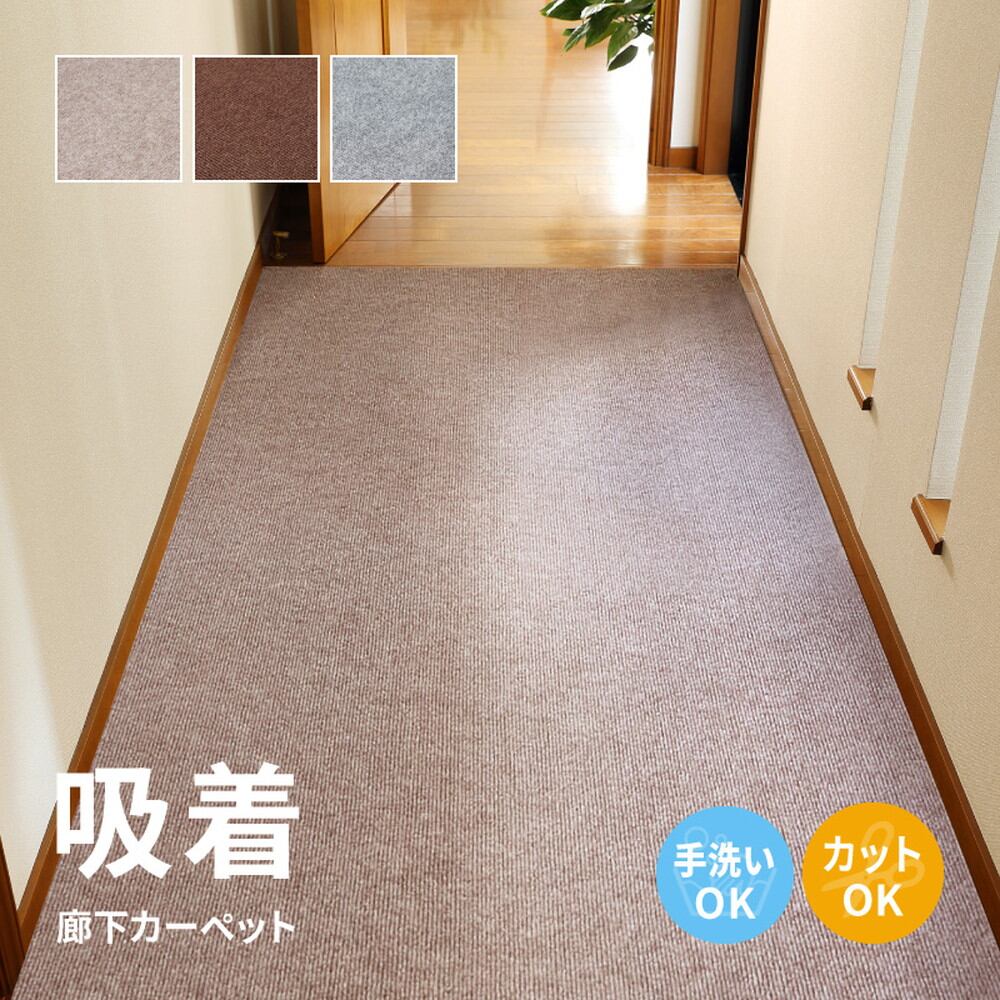 裏面が床にぴたっとくっつく加工で滑りにくい、吸着タイプの廊下敷きマットです。床のキズ防止や足元の冷え防止、足音などの防音対策に。ハサミやカッターナイフでカットできるため、お好きなサイズでお使いいただけます。毛足が短くお手入れもかんたん、汚れても手洗いOKだからいつも清潔に使え、お子様やペットと暮らすご家庭にもおすすめです。床暖房にも対応しています。