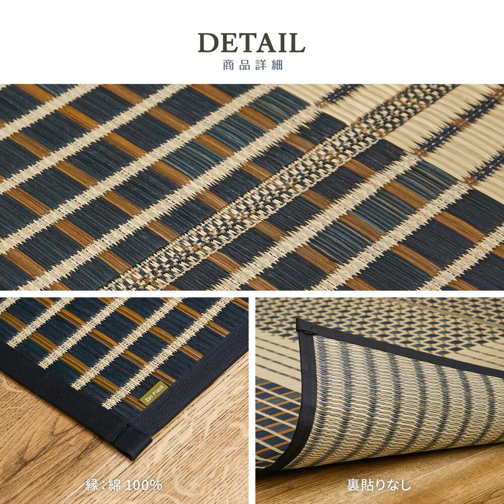 上質な国産い草のみを使用した国産のい草ラグ。い草の「染」にもこだわり、職人の業で鮮やかな色合いに染め上げました。三重織という織り方で、経糸を多く使用し、西陣織のように柄が細かく浮き上がった三層構造になっているため、しっかりとした重厚感のある一枚に。