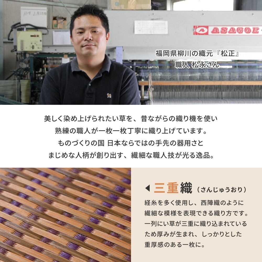 上質な国産い草のみを使用した国産のい草ラグ。い草の「染」にもこだわり、職人の業で鮮やかな色合いに染め上げました。お部屋に取り入れやすいシンプルなデザインで使いやすく、北欧家具にもマッチする色合いでお部屋に華を添えること間違いなし。