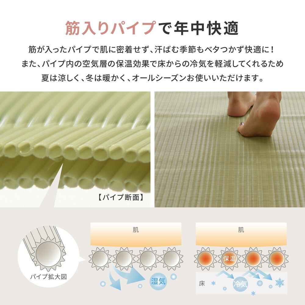 パイプの表面に筋が入っている筋入りパイプで、肌に密着しないからベタベタしにくく、汗ばむ季節でも快適に。また、パイプ内の空気層の保温効果で床からの冷気を防ぐため、寒い季節でもあたたかく過ごせます。