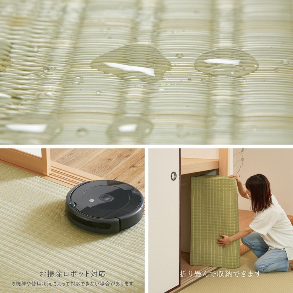水に強い素材でできた、い草風のカーペット。パイプの表面に筋が入っている筋入りパイプで、肌に密着しないからべたつきにくく、汗ばむ季節にもさわやかにお使いいただけます。お手入れしやすく、汚れても手軽に洗えるため、ペットとの暮らしやアウトドアにもおすすめです。